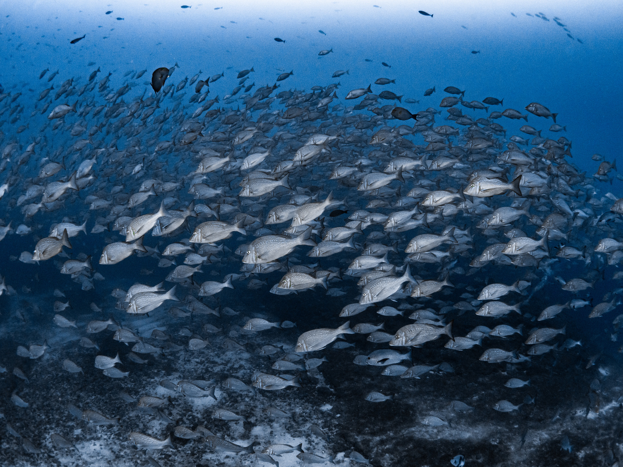 中層にはシェブロンバラクーダやハギ群れ